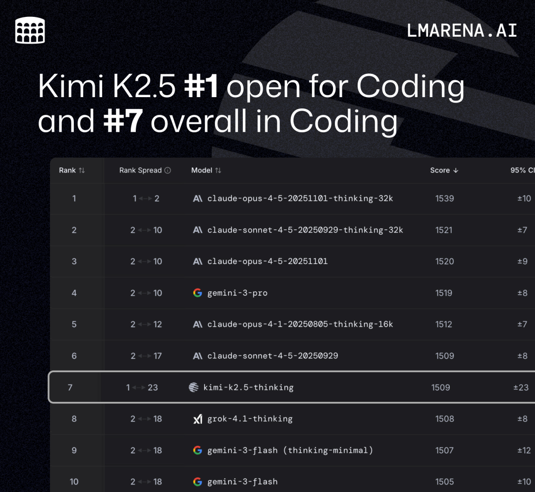 在专门评测代码能力的 LM Arena 榜单上,Kimi 2.5 位列总榜第七,依然是所有开源模型里最能打的那个。