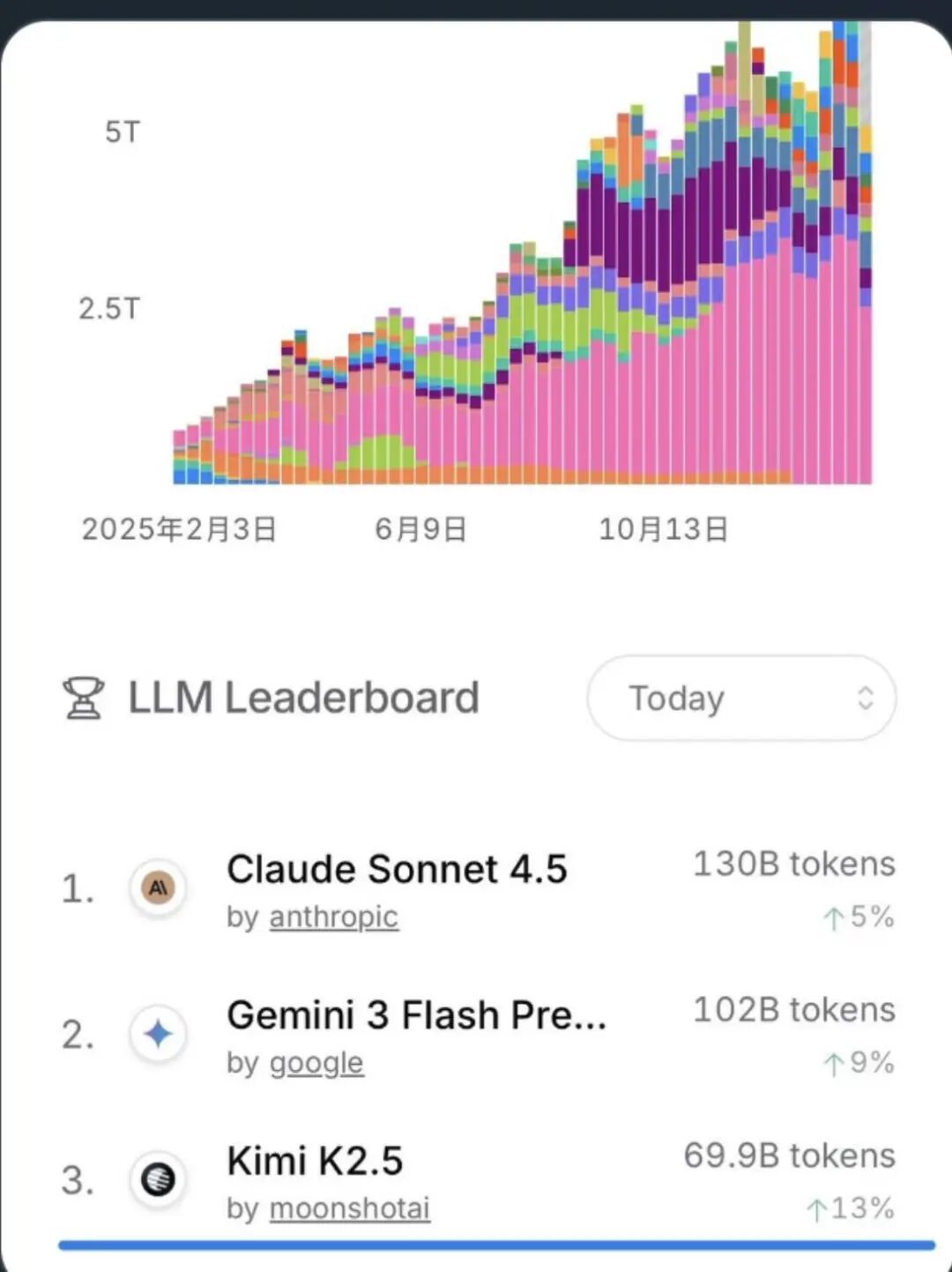 在这里,Kimi 2.5的调用量已经杀进全球第三,排在它前面的,只剩下Claude和Gemini这两大闭源巨头。