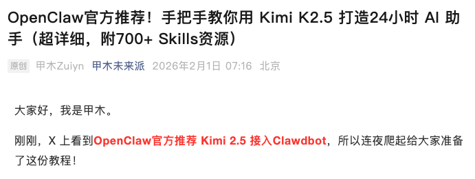 原来,就在昨晚最近火得一塌糊涂的开源AI智能体平台 OpenClaw,冷不丁扔了个重磅消息:它宣布,Kimi K2.5 成为其平台上首个可以免费使用的主力模型。