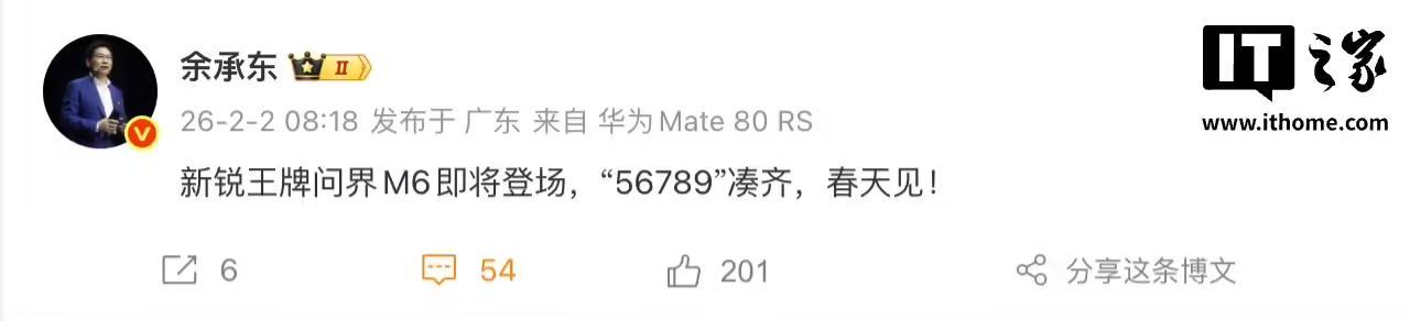 IT之家 2 月 2 日消息,今天上午,华为常务董事、产品投资委员会主任、终端 BG 董事长余承东在微博发文称:新锐王牌问界 M6 即将登场,“56789”凑齐,春天见!