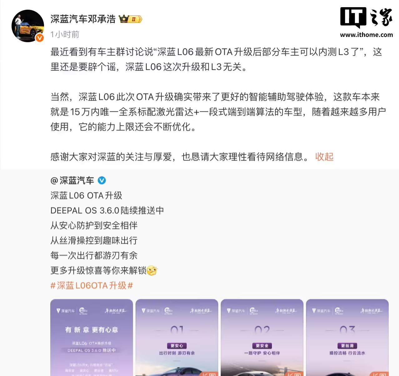 今天上午,深蓝汽车董事长邓承浩对此作出回应:这里还是要辟个谣,深蓝 L06 这次升级和 L3 无关。邓承浩介绍,此次 OTA 升级“确实为新车带来了更好的智能辅助驾驶体验”。