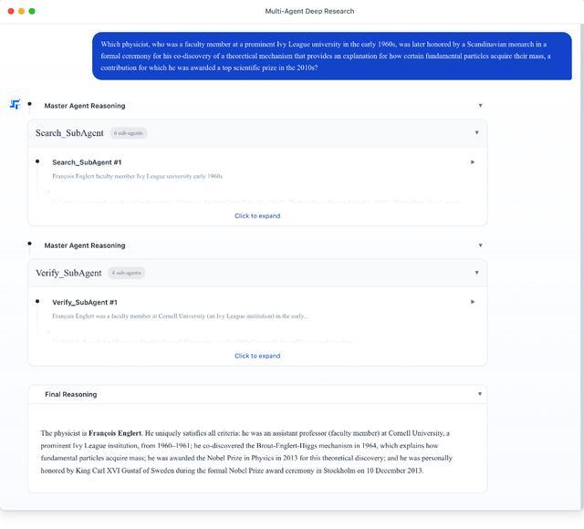 这个分层框架会派遣专门的“搜索”和“验证”智能体,通过并行工具调用循环来处理信息检索和事实核查。为确保精确性,一个“总结”智能体会将每个子智能体的执行轨迹整合为结构化反馈,使主智能体能够综合生成最终连贯的响应。