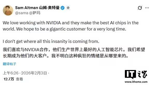 IT之家 2 月 3 日消息,OpenAI 首席执行官萨姆・奥尔特曼(Sam Altman)今日在 X 平台(前身为推特)发文称:“我们喜欢与英伟达合作,他们生产世界上最好的人工智能芯片。我们希望长期成为他们的大客户。我实在搞不懂这些毫无根据的疯狂传言是从哪里来的。”