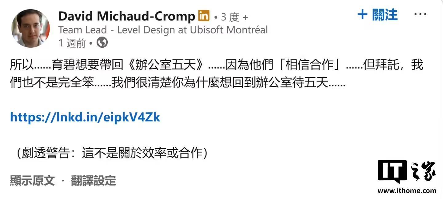 育碧蒙特利尔工作室的一名团队负责人 David Michaud-Crop 在其个人领英账号发文,公开批评公司的“重返办公室”政策。他在帖子中质疑,在各个团队证明远程办公同样能交付成果的前提下,强制员工回到办公室是否真的能带来更高效率。
