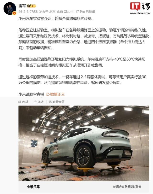 IT之家 2 月 3 日消息,小米创办人、董事长兼 CEO 雷军今日发文详细介绍了小米汽车实验室中的轮耦合道路模拟试验室,其可以模拟整车在各种颠簸路面上的振动,验证车辆的结构耐久性。