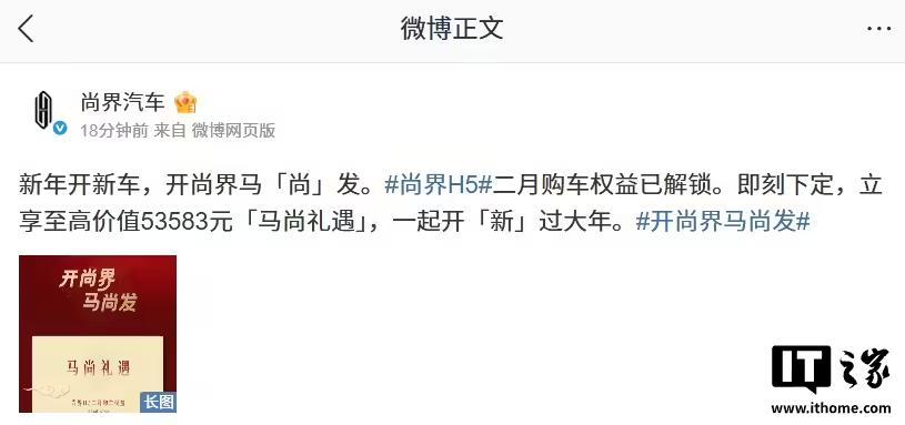 IT之家 2 月 3 日消息,鸿蒙智行尚界汽车官方微博今日公布了尚界 H5 的二月购车权益,含星闪实体车钥匙、HUAWEI ADS 高阶功能包补贴、9000 元现金优惠等。