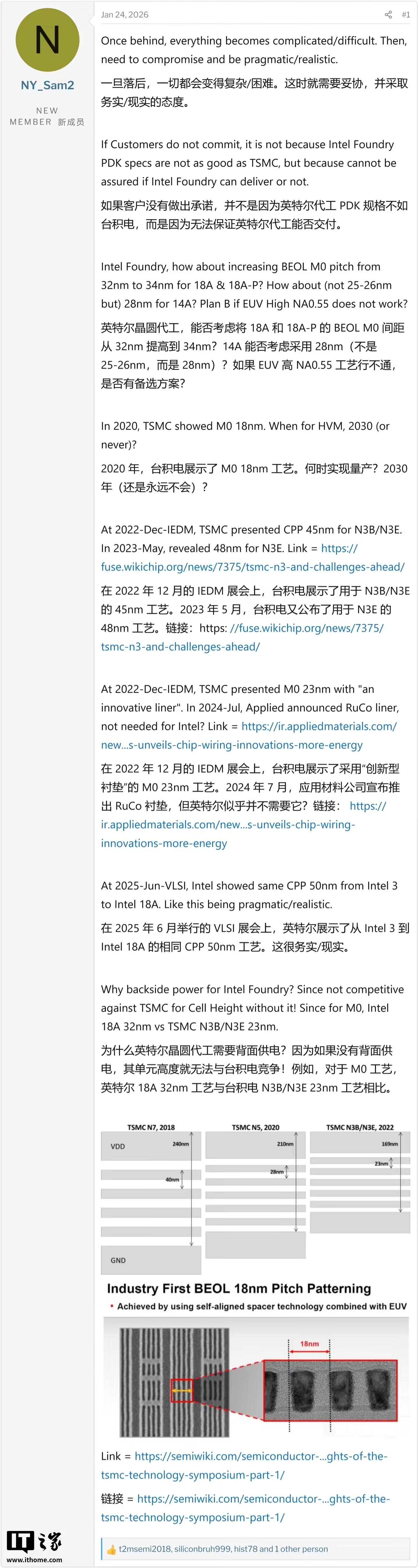 行业专家 IanD 指出在保持相同芯片核心温度(Hotspots)的前提下,采用 BSPD 技术的芯片需要散热器温度降低约 20°C 才能维持热平衡。IT之家附上相关截图如下: