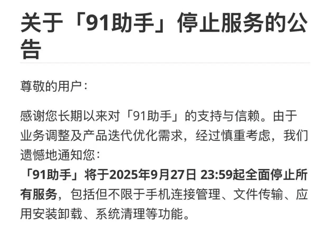 然而,由于App呈现孤岛化的发展路径,且百度并不掌握微信、抖音、小红书等平台级App才是入口型产品;另一方面,应用分发带来巨大的利益促使各大手机厂纷纷自己接管应用市场。三重打击之下,91助手迅速沦为了“鸡肋”,并于2025年9月正式停服。