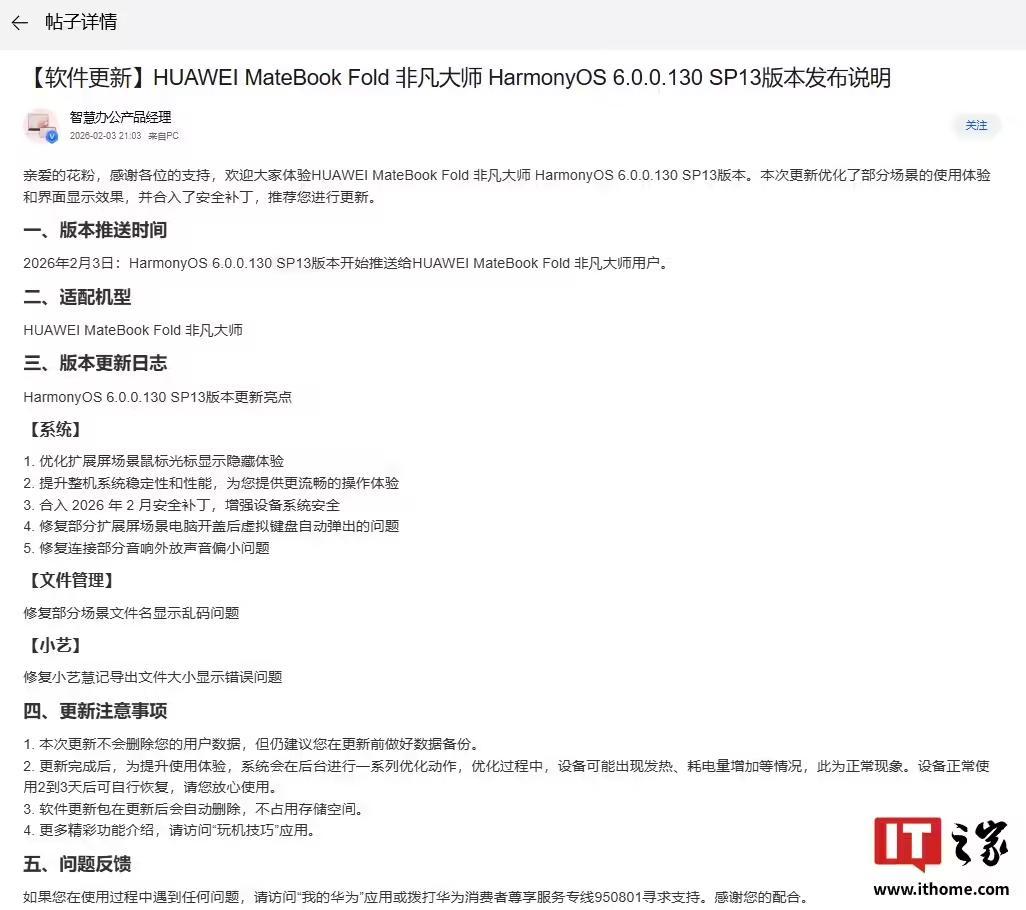IT之家 2 月 4 日消息,据华为官方团队 @智慧办公产品经理 分享,华为 MateBook Fold 非凡大师折叠屏电脑已开启 HarmonyOS 6.0.0.130 SP13 版本升级。本次更新优化了部分场景的使用体验和界面显示效果,并合入了安全补丁。