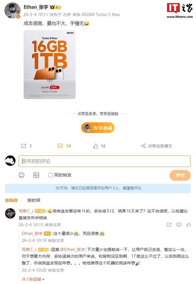 IT之家注意到,小米 REDMI 手机市场经理张宇今日发文透露,REDMI Turbo 5 Max 新增的 16GB+1TB 版本“成本很高,量也不大,手慢无”。