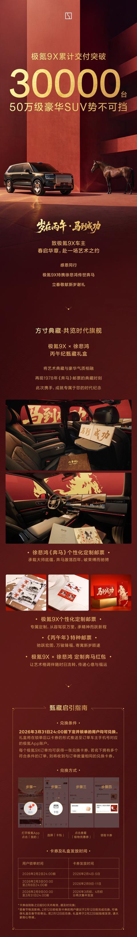 与此同时,极氪宣布面向 3 月 31 日前锁单的极氪 9X 车主推出专属的“极氪 9X × 徐悲鸿甄藏礼盒”,内含徐悲鸿《奔马》个性化定制邮票、极氪 9X 个性化定制邮票、《丙午年》特种邮票、极氪 9X× 徐悲鸿定制奔马红包。