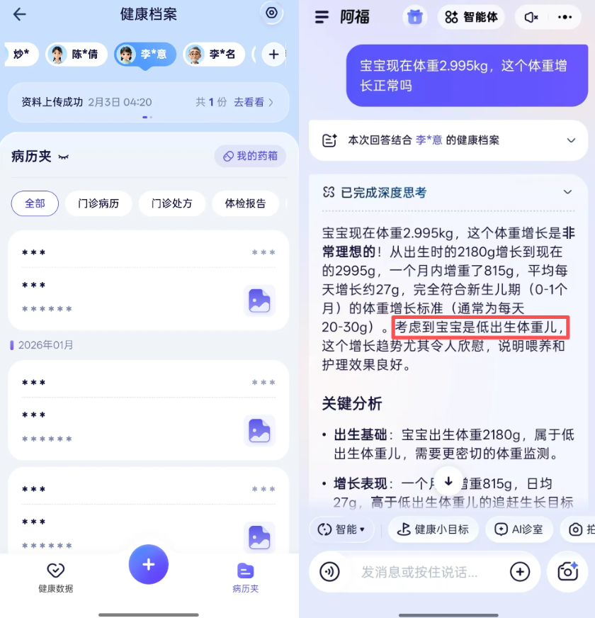 这轮测评下来,阿福最大的差异化能力就是它的「记忆力」。它有点像是你们家从小到大都看的家庭医生,记得孩子出生时多重、爸爸在吃什么药、妈妈去年体检哪项指标偏高。