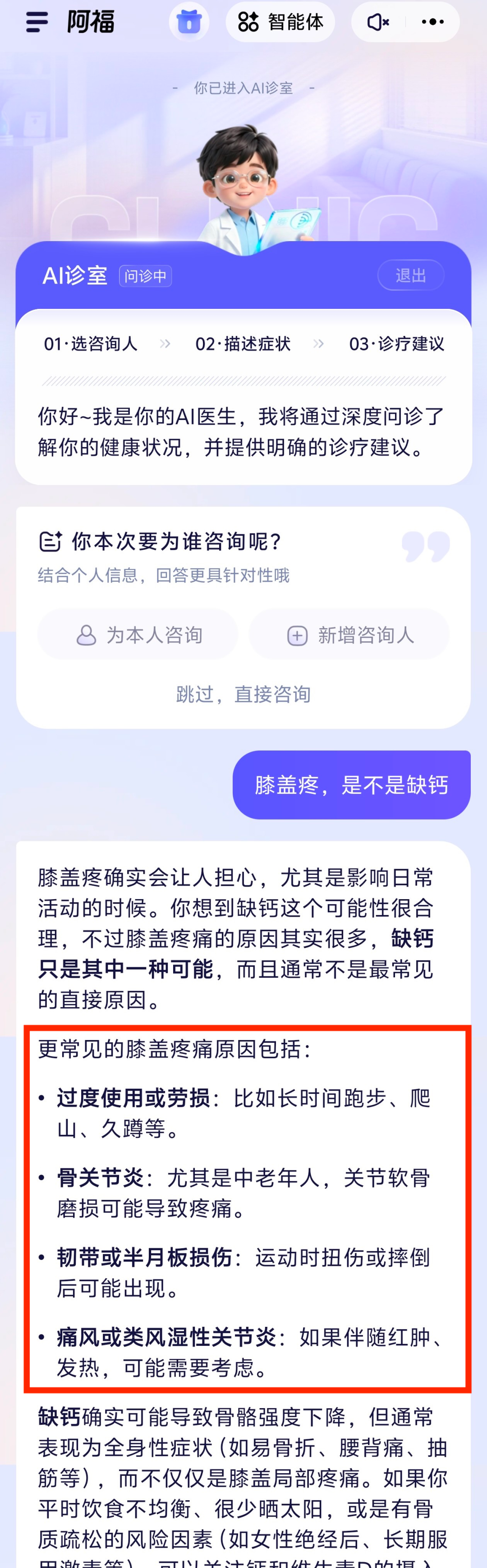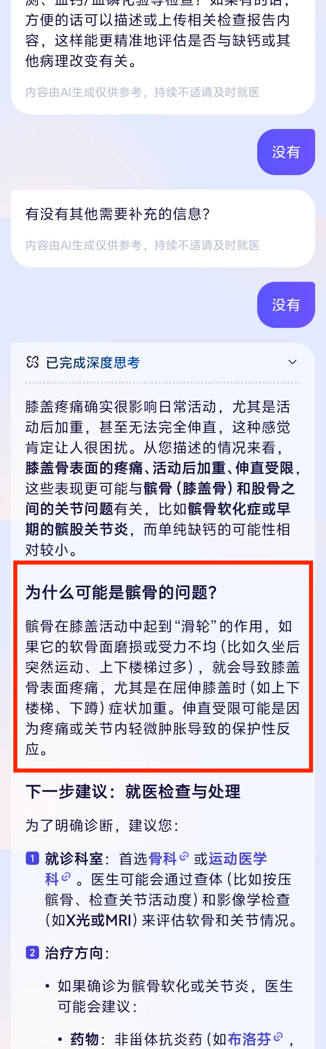 阿福真正厉害的地方,是在多轮对话中体现出来的。在 AI 问诊模式下,当我问这个问题,它先给出一个比较全面的建议。通用 AI 一般到这就结束了,但阿福会像真人医生一样多轮追问:疼痛具体在哪个位置? 上下楼梯时会不会加重? 有什么诱发症状吗? 有没有受过伤? 做过相关检查吗?