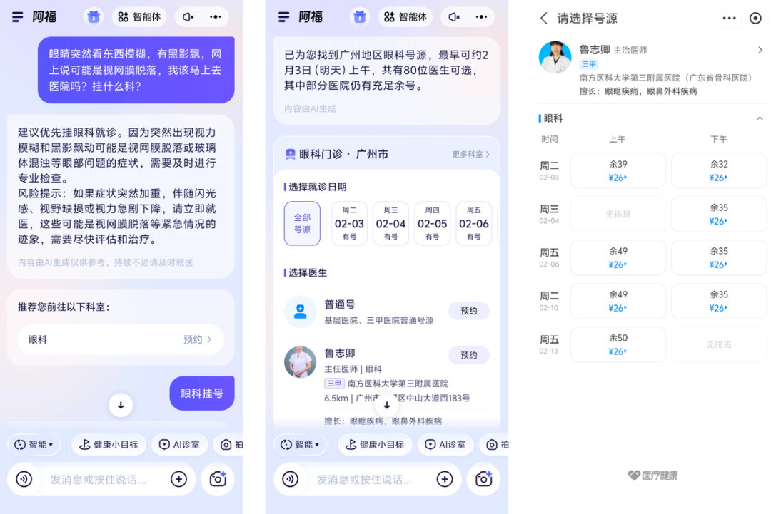 「眼睛突然看东西模糊,有黑影飘,网上说可能是视网膜脱落,我该马上去医院吗?挂什么科?」阿福在完成初步分诊、建议挂「眼科」后,并没有就此止步,而是直接推送了「快速挂号」入口。
