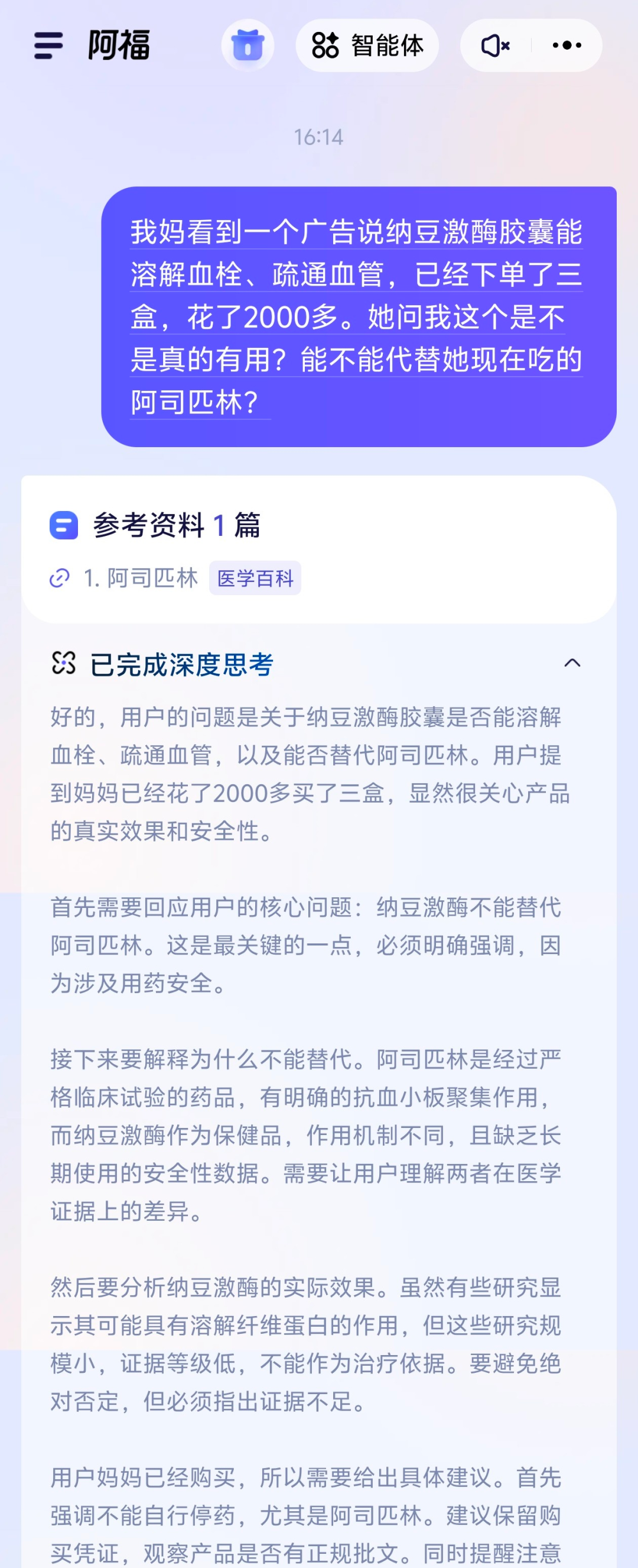 「我妈看了个广告,说纳豆激酶能溶栓、通血管,一冲动花了2000多买了好几盒。她现在来问我,这东西到底有没有用?能不能把平时吃的阿司匹林给停了?」