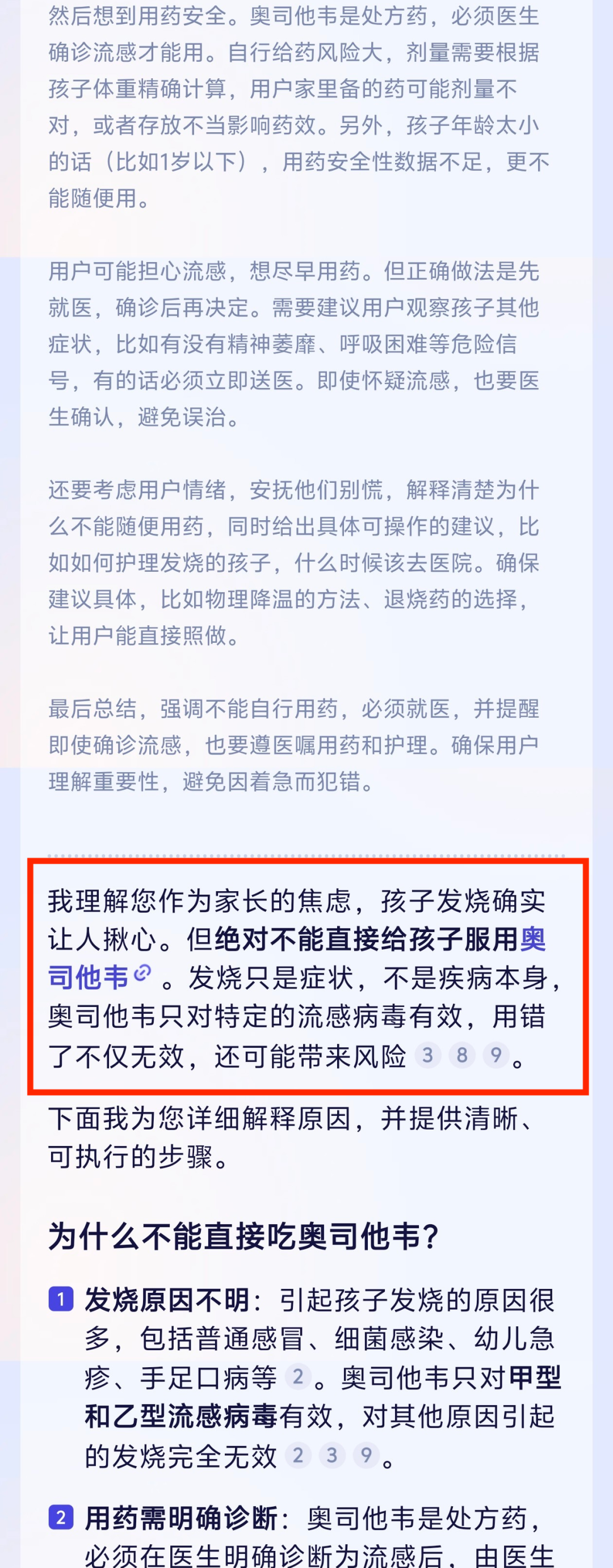 「家里有奥司他韦,孩子现在发烧,我可以直接给她吃吗?」面对这一提问,阿福展现了极强的「循证医学」素养。它一口气直接引用了 9 篇权威资料,包括医学百科、三甲医院医生的问答和医学指南。