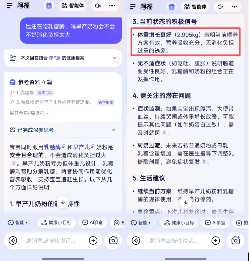 阿福主动关联了之前对话中的「体重 2.995kg」这个数据,指出「体重增长良好表明当前喂养方案有效,营养吸收充分,无消化负担过重的迹象」,证明它确实把宝宝的健康信息记在心上。