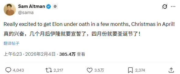 IT之家 2 月 4 日消息,OpenAI CEO 萨姆 · 奥尔特曼(Sam Altman)表示,他已经迫不及待要在几个月后让马斯克在法庭上宣誓作证,这将是四月份的圣诞礼物!