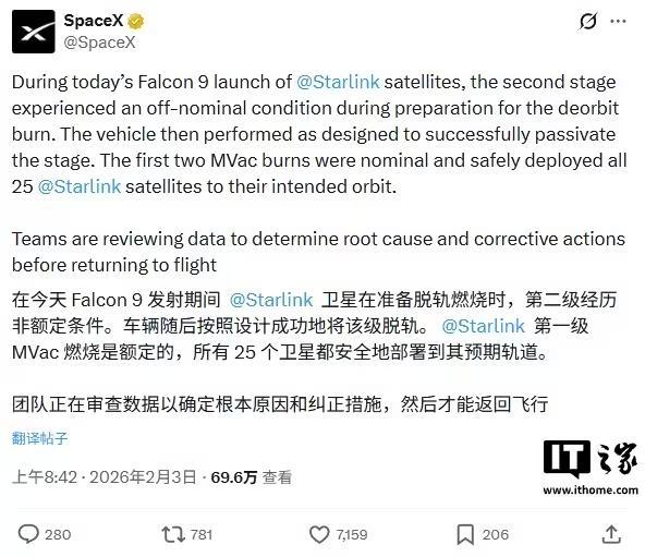 IT之家 2 月 4 日消息,据新华社今日报道,SpaceX“猎鹰 9”火箭在“星链”卫星发射任务中出现异常。随后该公司宣布,在查明原因并完成整改前将暂停“猎鹰 9”后续发射任务。新华社指出,此举可能影响美国计划于近期实施的载人航天发射任务。