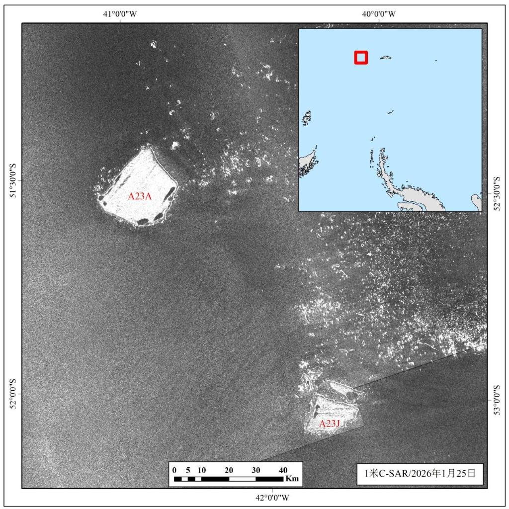 监测报告显示,截至2026年1月,A23a冰山已分裂出A23b至A23j九个相对较小的子冰山,A23a冰山面积也减少为531平方公里,仅为2023年底的八分之一左右。