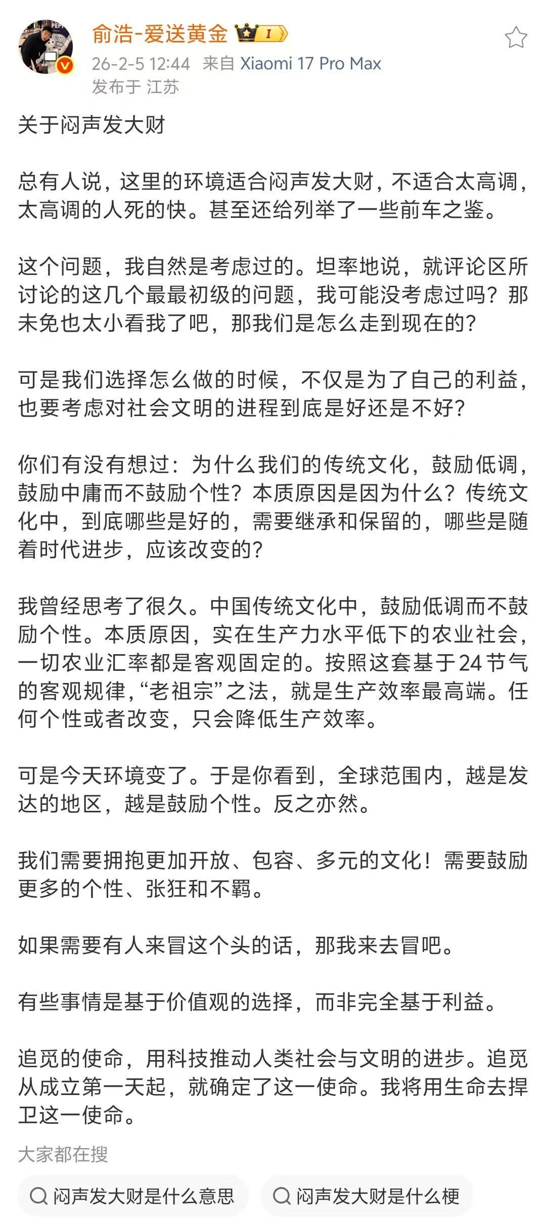 凤凰网科技讯 2月5日,追觅科技创始人兼CEO俞浩发文谈“闷声发大财”。他表示,当前环境已不同于生产力水平低下的农业社会,不再适合完全遵循强调低调、抑制个性的旧有文化模式。