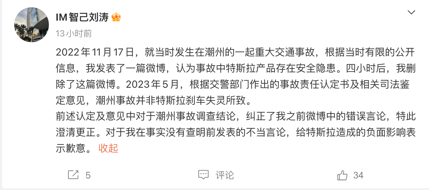 刘涛此次在微博中表示,2023年5月,根据交警部门作出的事故责任认定书及相关司法鉴定意见,潮州事故并非特斯拉刹车失灵所致。“前述认定及意见中对于潮州事故调查结论,纠正了我之前微博中的错误言论,特此澄清更正。对于我在事实没有查明前发表的不当言论,给特斯拉造成的负面影响表示歉意。”