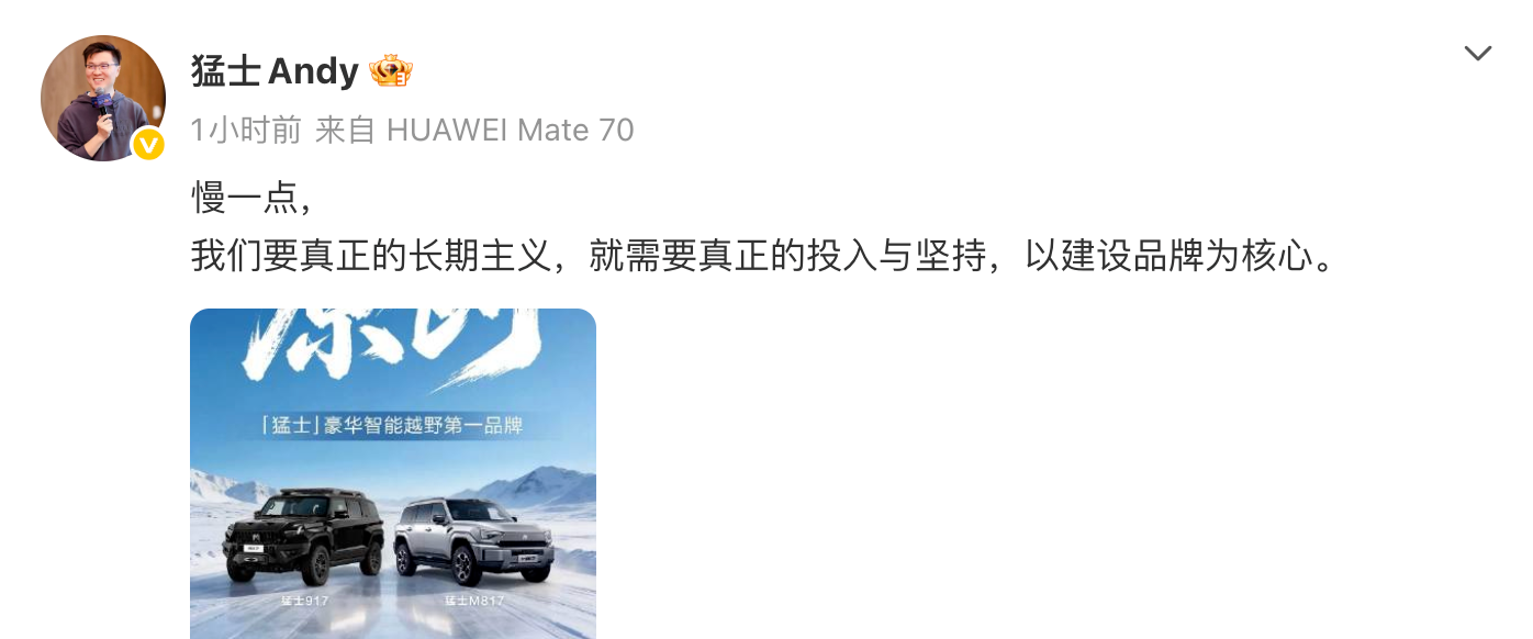 东风猛士高管暗指追觅抄袭 发布海报称“请尊重原创” 凤凰网科技讯(作者/云飞) 2月5日,东风猛士高管“猛士Andy”发文称,“慢一点,我们要真正的长期主义,就需要真正的投入与坚持,以建设品牌为核心”,并附上一张“请尊重原创”的海报。 据了解,追觅日前亮相了三款新车,分别命名为星际T08、星际T08L、星际D09。随后,“猛士Andy”指出该车神似猛士M817,并附图称:“买正品,认准猛士M817”,还给图中追觅新车星际T08打上了高仿标签。 此外,汽车博主韩路也表示,追觅SUV新车外观像猛士817和917。 Published by 风君子 独自遨游何稽首 揭天掀地慰生平 View all posts by 风君子