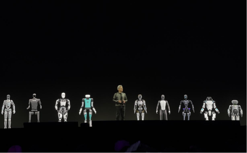 2024年的英伟达GTC AI大会上,黄仁勋身着黑色皮衣登场,宣布“一个新的产业已经出现”。与他同台的是九个机器人中有两个来自中国,分别是宇树和小鹏机器人PX5。