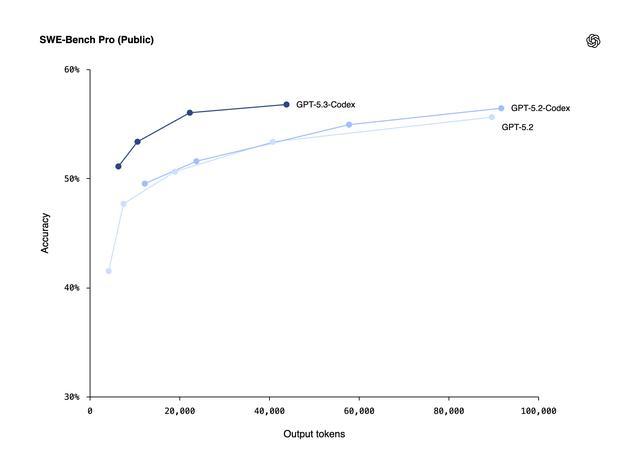 “值得注意的是,GPT-5.3-Codex在使用的token数量上低于任何此前模型,这让用户能够做更多事情。”