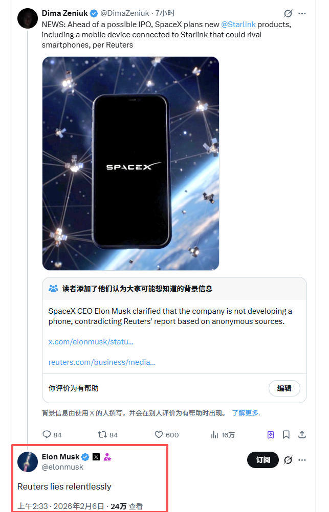 凤凰网科技讯 2月6日,针对路透社SpaceX将推出“星链手机”的报道,SpaceX首席执行官埃隆·马斯克(Elon Musk)在社交平台X上进行了辟谣,明确表示公司并未研发此类硬件产品。