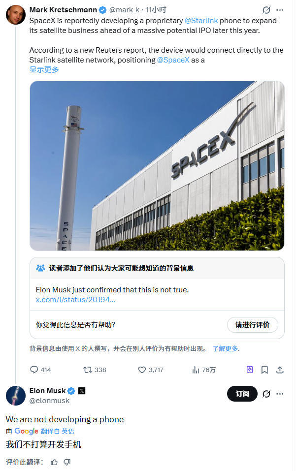 马斯克在回应相关报道时直接指出:“We are not developing a phone.”(我们没有在开发手机。) 他进一步批评部分媒体的报道内容不实,甚至直言路透社“谎话连篇”。