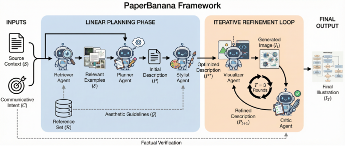 PaperBanana试图用五个专业化的智能体协作模拟这一过程:先参考同类作品确定结构范式,再规划生成内容的逻辑,根据审美学的规范,最后通过多轮自省迭代进行优化。