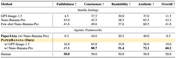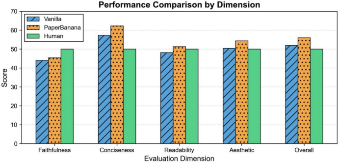此外,由于采用相对评分制,研究团队将人类绘制的参考配图的综合得分和在四个维度上的得分均设置为50,而PaperBanana的生成结果在忠实性以外的三个维度都已超越人类水平。