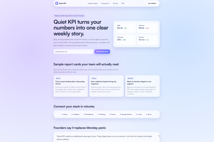 它还做了一个自动切换的用户评价轮播,包含三条不同的用户评价,而不是只有一条,让整个页面感觉更完整、更接近可以上线的状态。