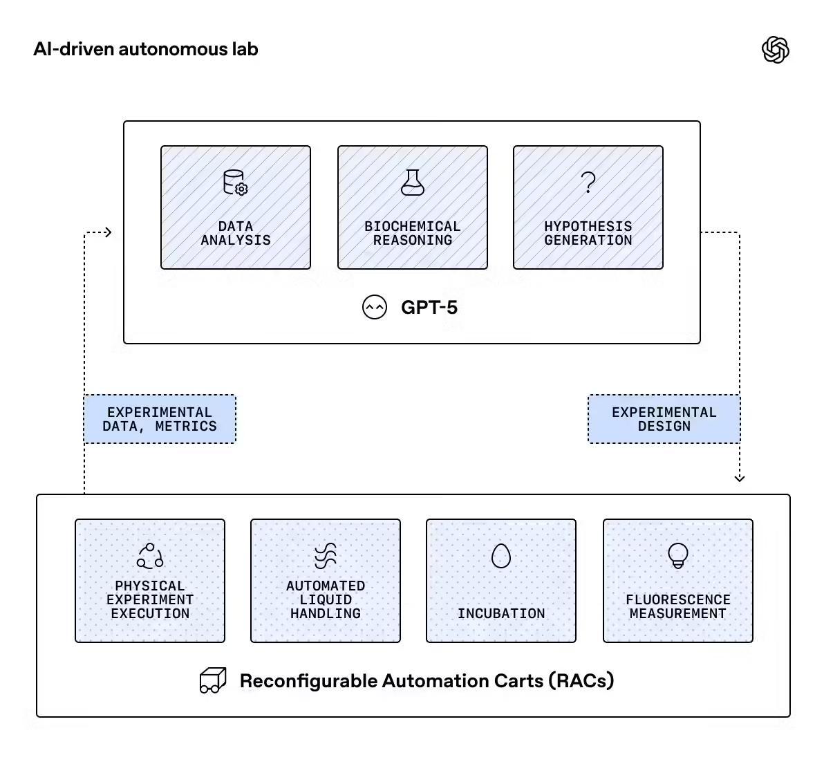 在双方构建的“闭环自动化系统”中,GPT-5 直接连接到云端湿实验室(Wet Lab),不仅负责设计实验,还能指挥机器人执行操作、分析回传数据并自主规划下一轮实验。