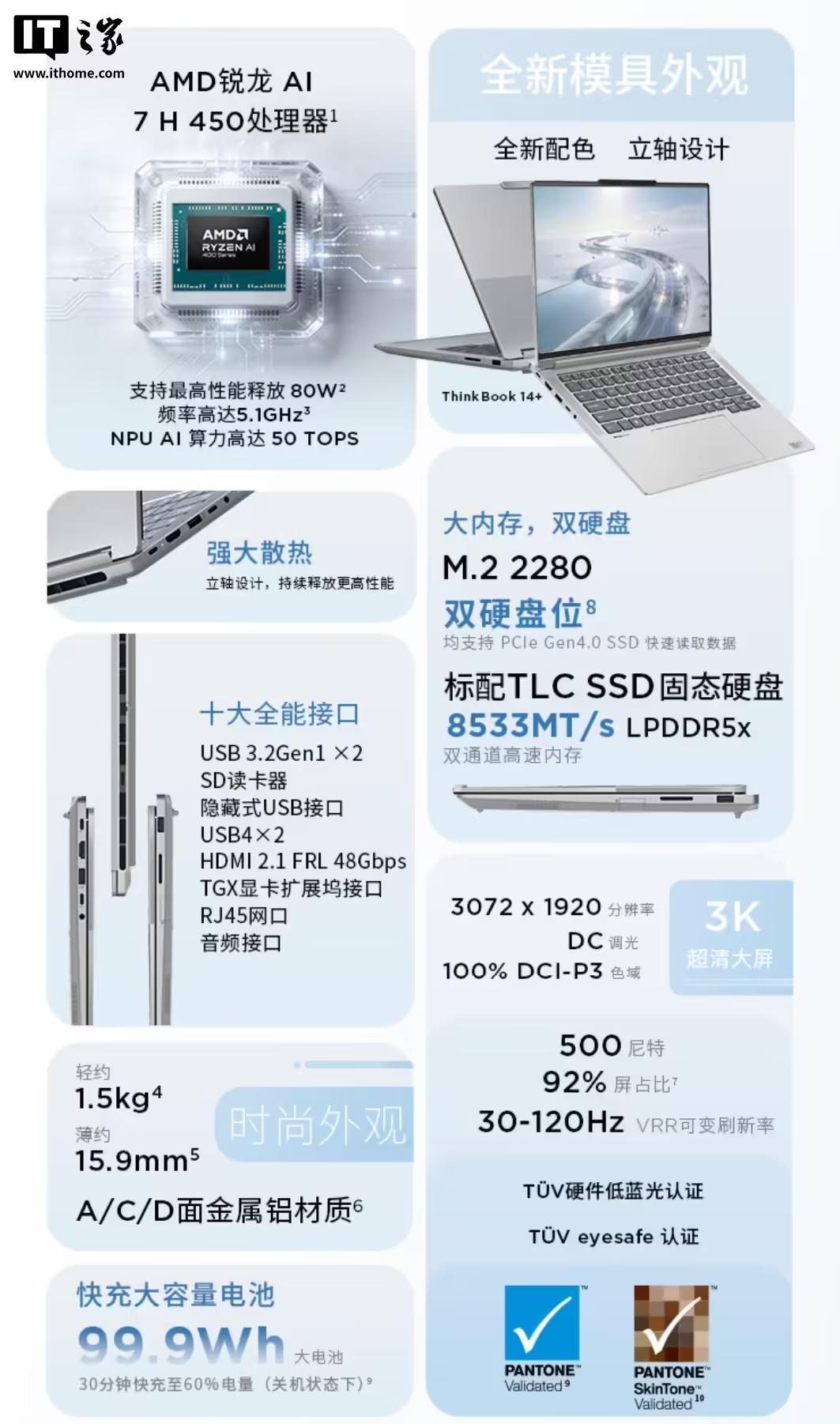 规格方面,这款笔记本配备 Smart Power On 智能系统,带有全新立轴设计,可带来更好散热效果,搭载 14.5 英寸 3K 屏幕,分辨率可达 3072*1920,支持 120Hz 高刷,覆盖 100% DCI-P3 色域,最高亮度 500 尼特,出厂经过 Pantone 彩通测试,号称能够还原超 130 种不同人类肤色色彩。
