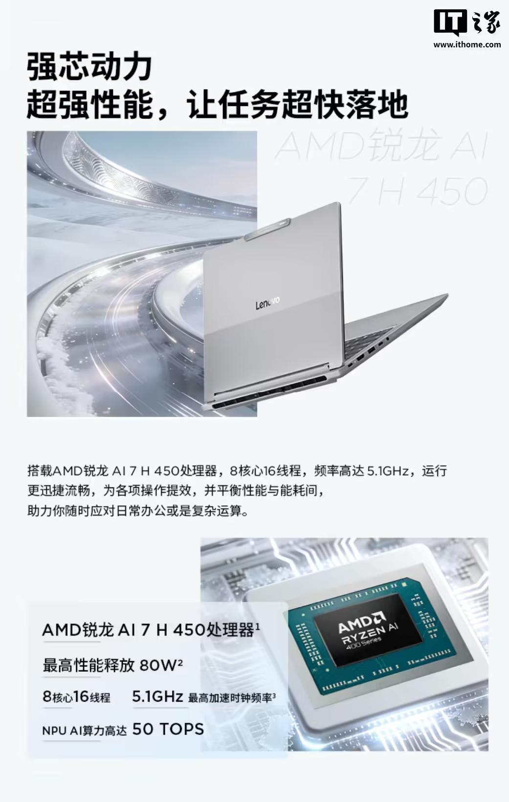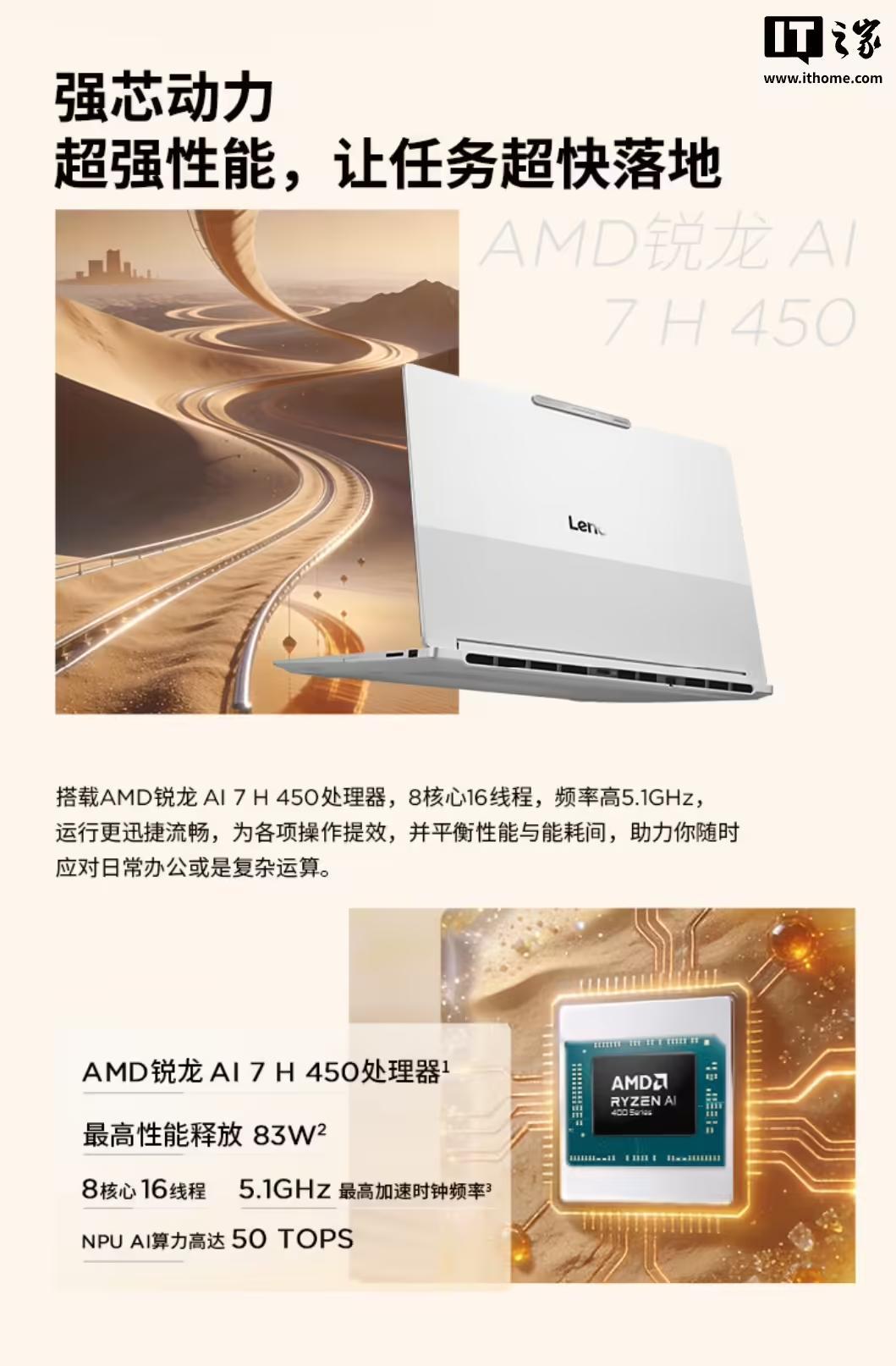 这款笔记本搭载的处理器采用 8 核心 16 线程设计,加速频率至高可达 5.1GHz,最高性能释放 80W,NPU AI 算力可达 50 TOPS,内置 Radeon 860M 集成显卡,满足日常办公以及轻度游戏需求,A/C/D 面采用金属铝材质,A 面还带有两种喷砂工艺,支持 180° 开合。