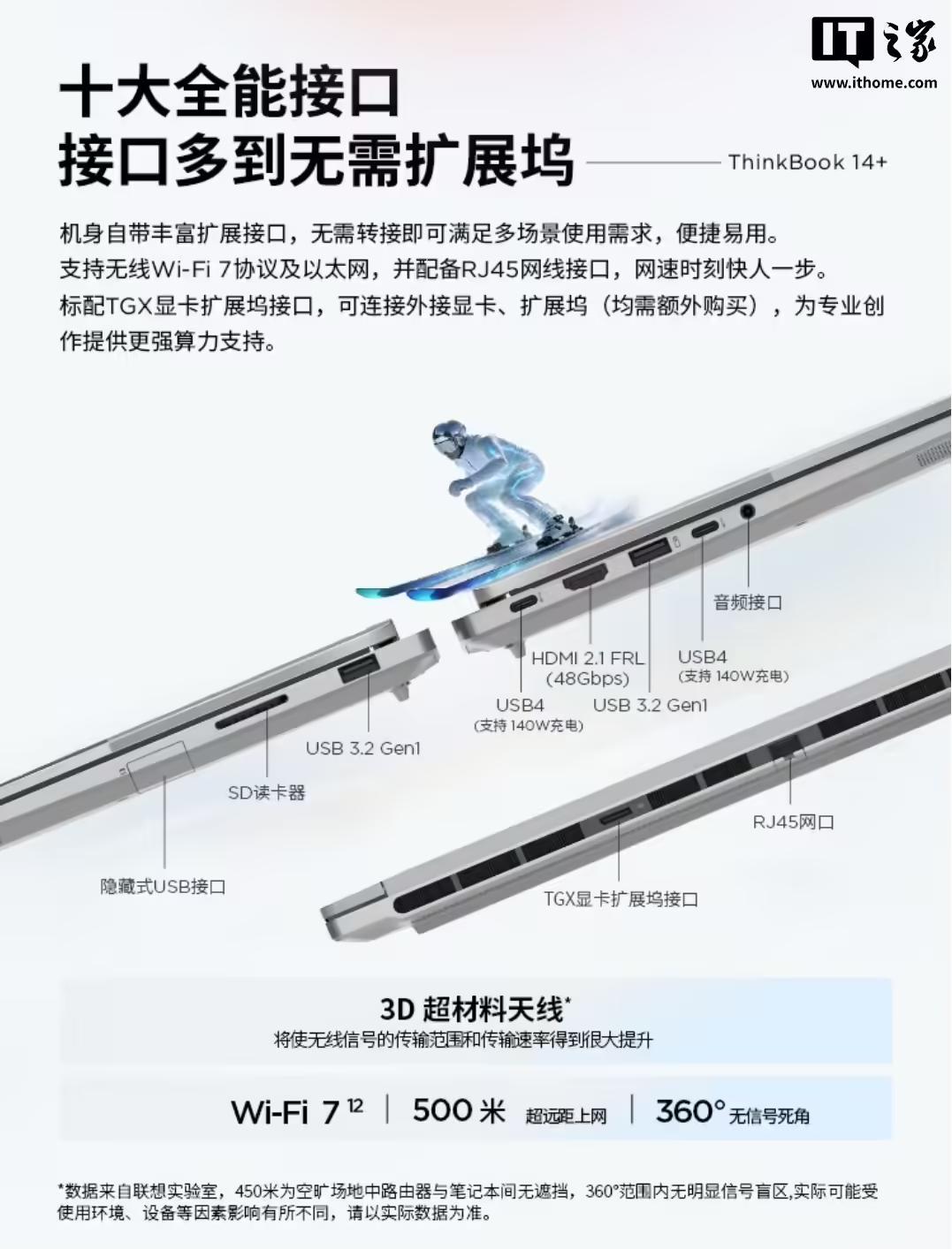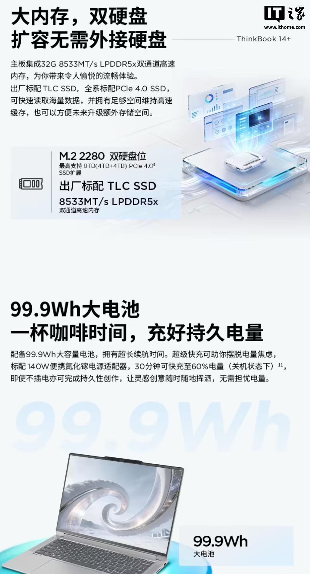 规格方面,这款笔记本的内存参数与 14+ 一样,标配 TLC PCIe 4.0 固态硬盘,留有一个 PCIe 4.0 硬盘位,支持扩容至 8TB,带有 99.99Wh 电池,标配 140W 便携氮化镓充电器,带有 1.5mm 键程背光键盘,自带小键盘,标配指纹识别电源键、ForcePad 压感触控板和 IR 摄像头。