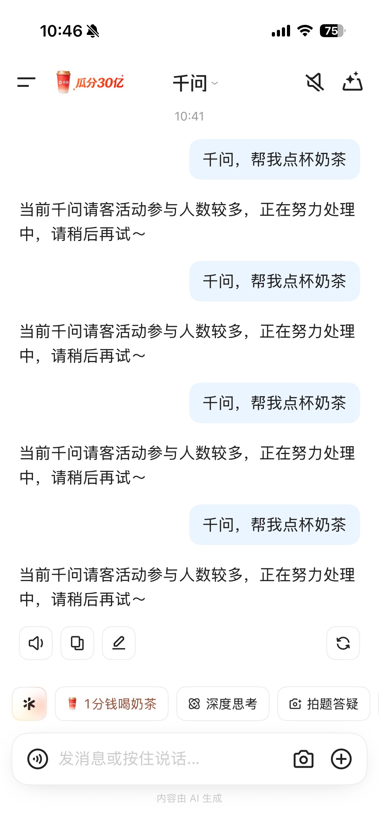 阿里千问"请客喝奶茶"活动引流量洪峰:App卡顿、门店被迫歇业 凤凰网科技讯 2月6日上午,千问开启新年送奶茶活动,访问人数短时间内激增。页面提示:“当前千问请客活动参与人数较多,正在努力处理中,请稍后再试。”凤凰网科技查询发现,多家奶茶门店因单量过多,已经选择临时闭店。 千问官方宣布,活动上线不到4小时,大家通过千问APP已下单超过200万单,并提醒用户免单卡使用期限可以到2月23日,如果暂时遇到拥堵,可以稍晚下单。 稍早前,千问APP多次出现卡顿现象,无法完成下单付款和分享。对此官方回应称:正在紧急加资源,全力保障顺畅。 Published by 风君子 独自遨游何稽首 揭天掀地慰生平 View all posts by 风君子