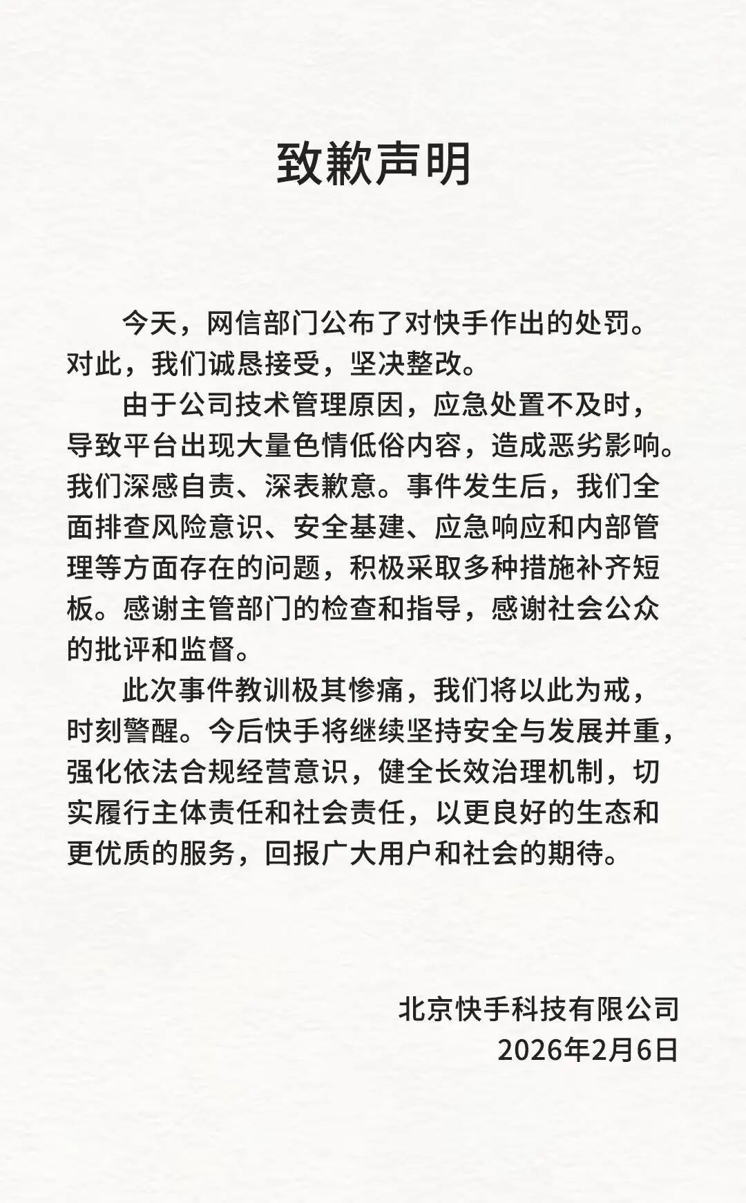 快手发布致歉声明:将健全长效治理机制 切实履行主体责任和社会责任 财联社2月6日电,快手发布致歉声明称,今天,网信部门公布了对快手作出的处罚。对此,快手诚恳接受,坚决整改。由于公司技术管理原因,应急处置不及时,导致平台出现大量色情低俗内容,造成恶劣影响。快手深感自责、深表歉意。事件发生后,我们全面排查风险意识、安全基建、应急响应和内部管理等方面存在的问题,积极采取多种措施补齐短板。今后快手将继续坚持安全与发展并重,强化依法合规经营意识,健全长效治理机制,切实履行主体责任和社会责任。 Published by 风君子 独自遨游何稽首 揭天掀地慰生平 View all posts by 风君子
