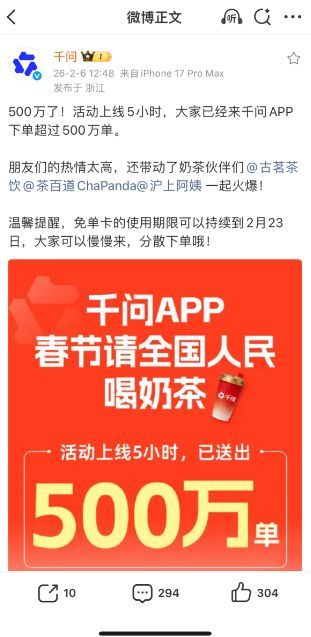 当天,阿里千问App(应用程序)“春节30亿大免单”活动正式上线,纪录不断被刷新——