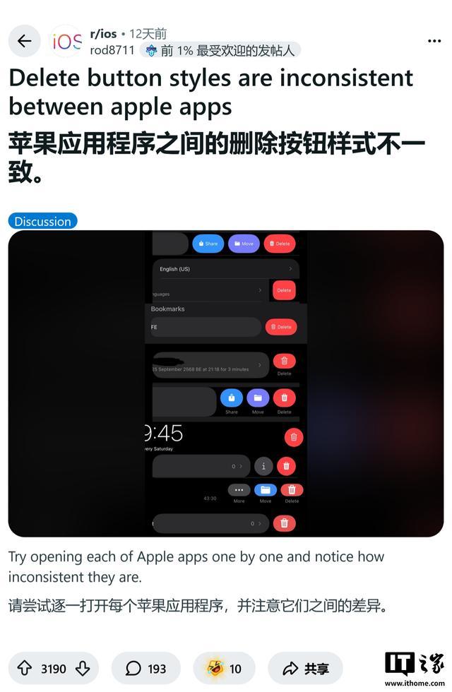 iPhone 17 等部分用户指出,在邮件(Mail)、照片(Photos)、设置(Settings)及备忘录(Notes)等原生应用中,执行删除操作的按钮样式、位置及交互逻辑竟完全不同。IT之家附上帖子截图如下: