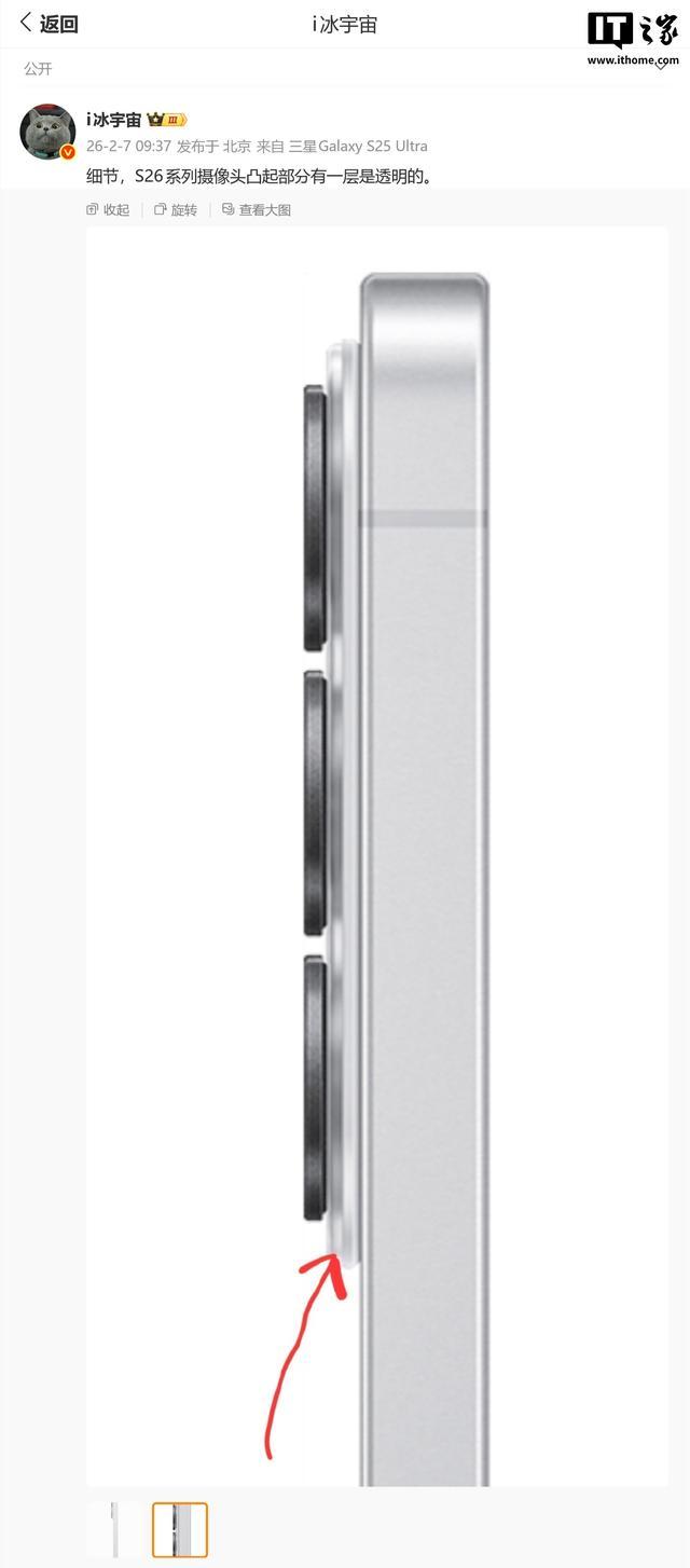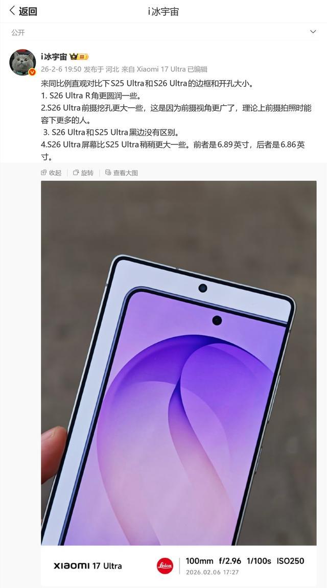 IT之家 2 月 7 日消息,消息源 @i冰宇宙 昨日(2 月 6 日)发布微博,分享了一张图片,同比例直观对比三星 Galaxy S25 Ultra 和 S26 Ultra 的边框和开孔大小。