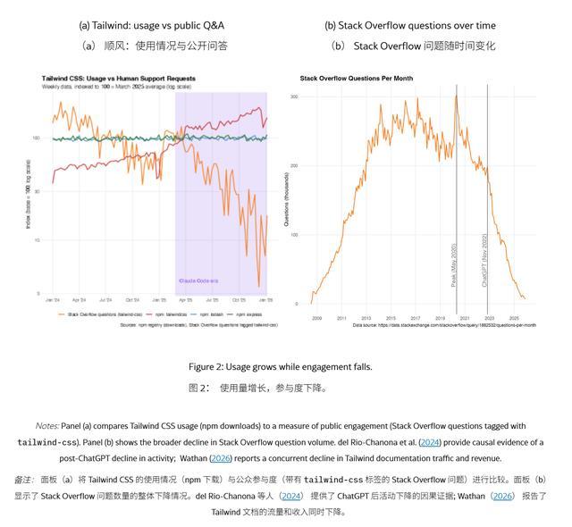 与此同时,Stack Overflow 等技术问答平台的流量也大幅下滑。这种背离现象表明,AI 工具正在“偷走”本应属于开源维护者的注意力红利,将原本的社区互动转化为封闭的模型推理过程。