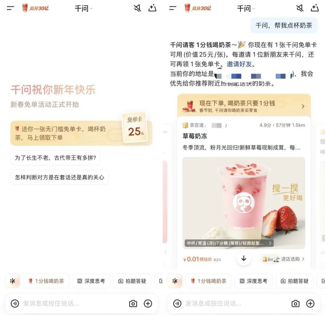 现在看来,经过一段时间的内测迭代,千问决定在春节节点全面开放相关能力。这次活动千问 APP 仍然延续了此前“会办事”的差异化打法。千问 APP 的 30 亿免单第一波不是直接发个现金红包,而是要借助购物免单的方式,通过吃喝玩乐的刚需和奶茶这个“引流爆品”,打造用户“有事找千问”的肌肉记忆。