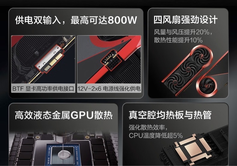 这款显卡采用了 3 盎司铜层 PCB、双 BIOS 及功率侦测器 +,还有液态金属 GPU 散热 + 真空腔均热板与热管 + 四散热风扇,风量与风压提升 20%,散热性能提升 10%,支持液氮超频及显存除霜技术(0℃ 临界值自动触发)。