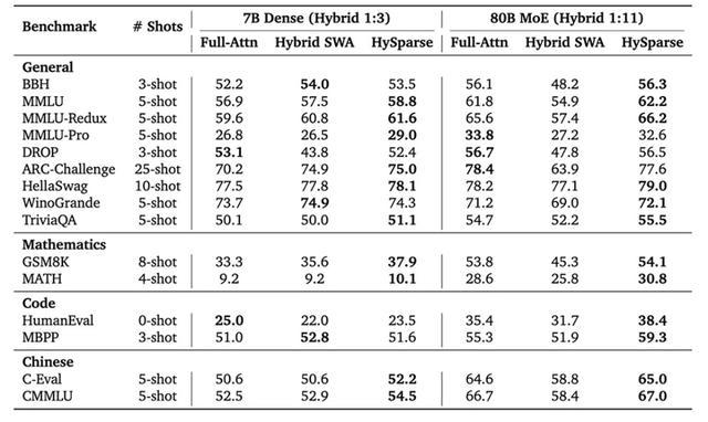 为此,小米MiMo提出了HySparse架构。在多项通用、数学、代码和中文评测中,HySparse在7B Dense和80B MoE两种规模均带来提升。