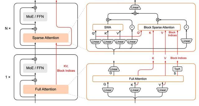 这背后的动机是Full Attention在完成自身计算的同时,已经生成了KV Cache,并且计算出了最准确的 token重要性信息,自然可以供后续N个Sparse Attention层直接复用。