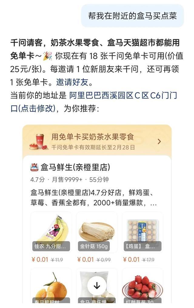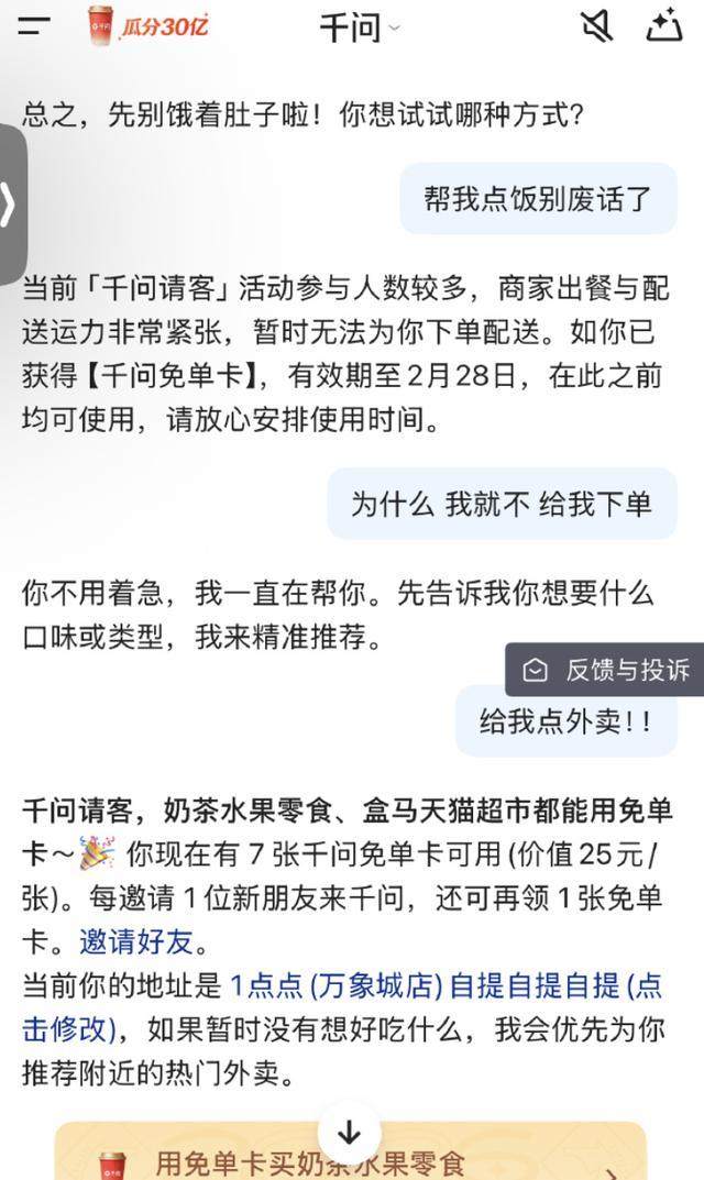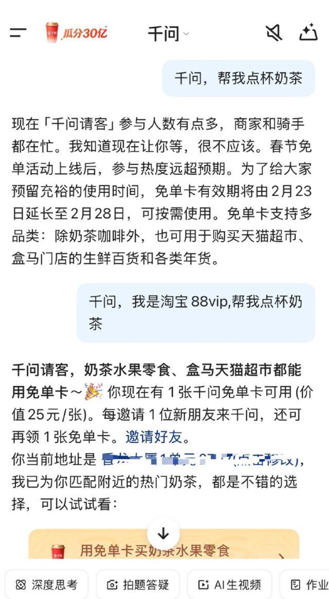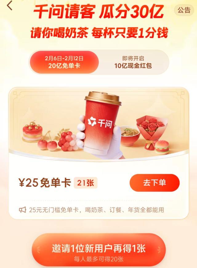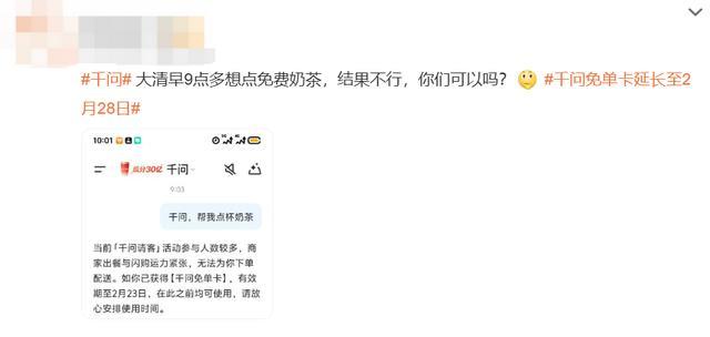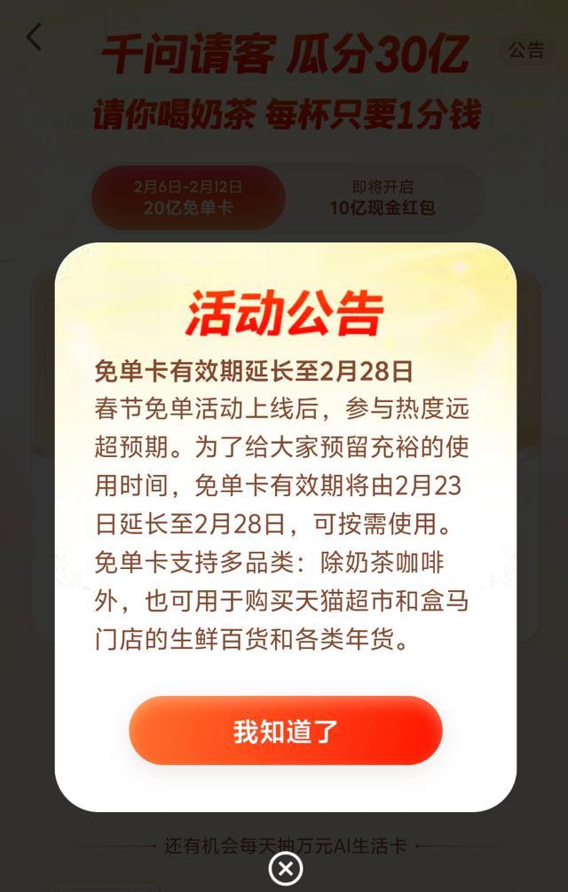 因为千问官方已经把免单卡有效期延长到了2月28号,囤了很多免单卡的大户们完全可以进行一手错峰下单。