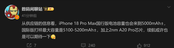 供应链渠道确认,iPhone 18 Pro Max的国行版电池容量将首次突破5000mAh,这标志着苹果在电池技术上的一次重大进步。国际版电池的容量更大,打样阶段最高可达5100-5200mAh,而相比之下,国行版的iPhone 17 Pro Max电池仅为4823mAh,iPhone 17 Pro则为3988mAh。